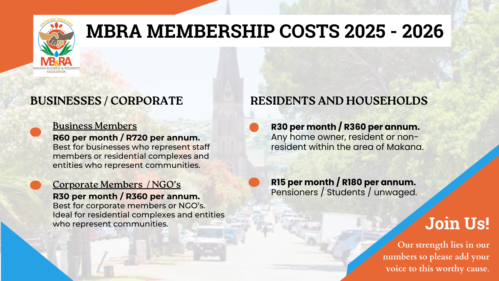 Whilst MB&RA charges as little as R30 per month for standard membership, with a discounted rate of R15 per month for pensioners and the unwaged (noting that we ask those who qualify for the discounted rate but can afford the full amount).